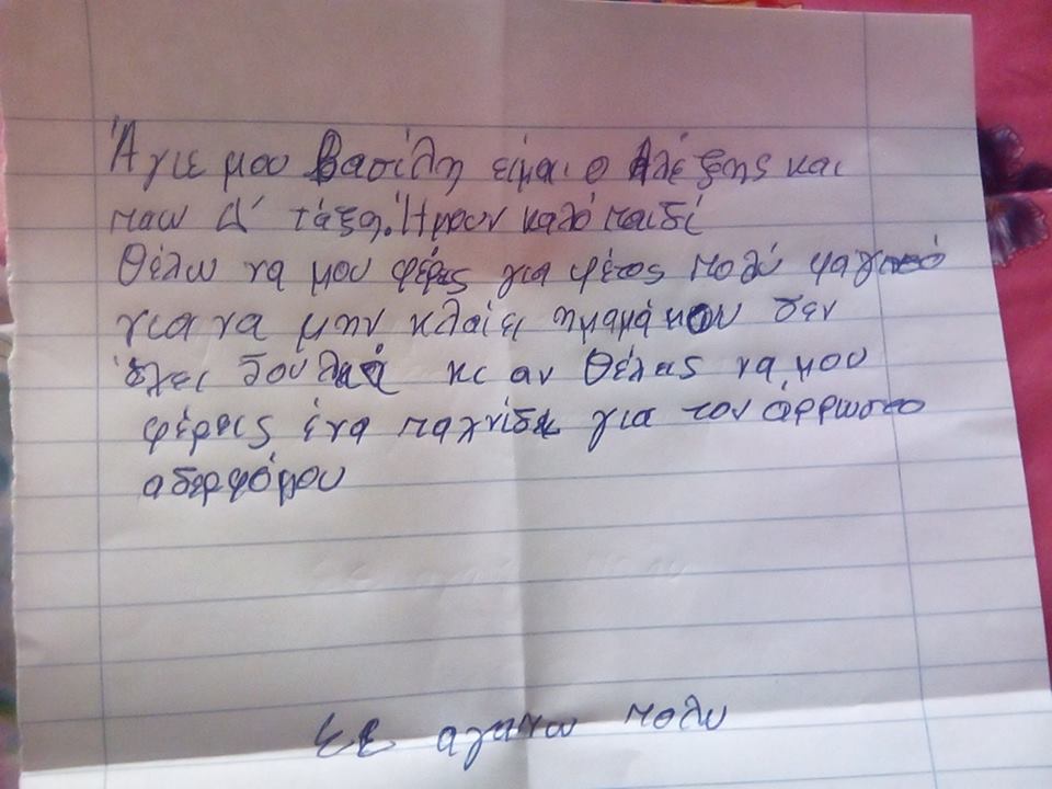 Δημοσίευσαν το γράμμα ενός 8χρονου μαθητή από την Πάτρα ο οποίος ζητά από τον Αγιο Βασίλη φαγητό.